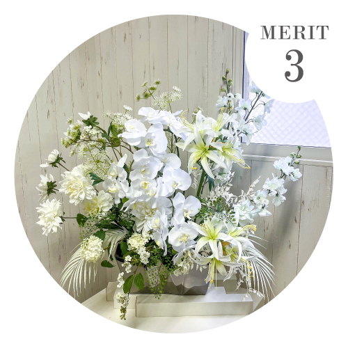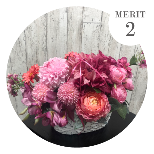 また、人工的な花のため、劣化しないこと、花材として再度利用しやすいことから、