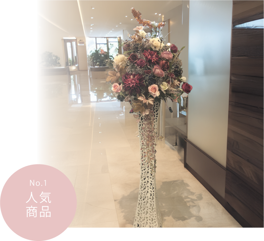 高く配置された花々は空間に立体感を与え、訪れる人々に温かさと歓迎の気持ちを伝えます。また、フラワースタンドは季節ごとのテーマや特別なイベントに合わせて簡単に変更できるため、常に新鮮で魅力的な雰囲気を保つことができます。